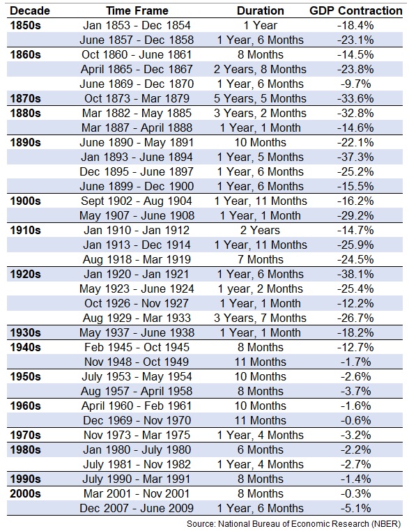 For example, in the modern era (since 1990) recessions have usually lasted under a year and seen GDP fall by less than 1.5%. The Financial Crisis, which froze vital credit markets and caused the most severe recession since 1945 was also unusually long at 18 months.